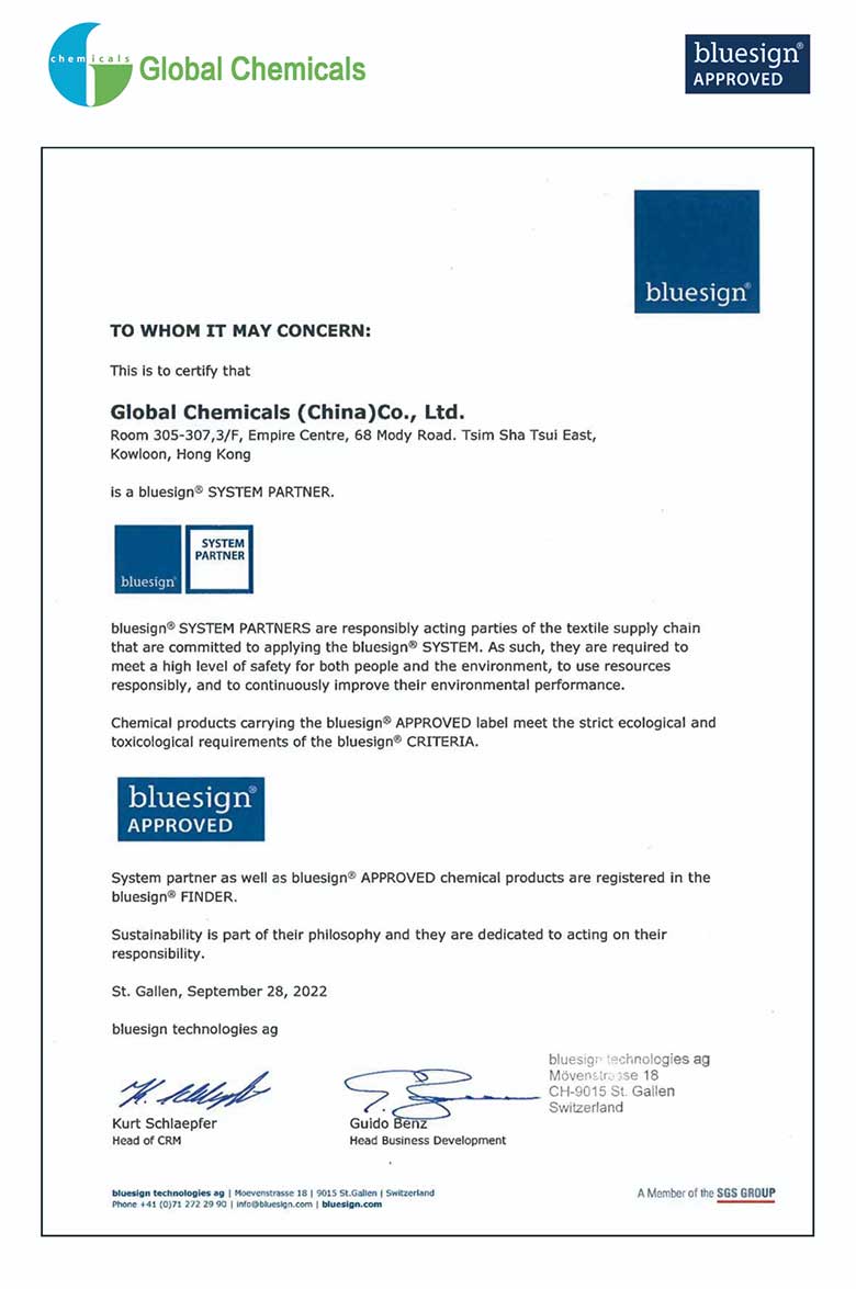 Recently, the cost-effective softener flake, 4D-Y from Global Chemicals has obtained Bluesign® Certification.